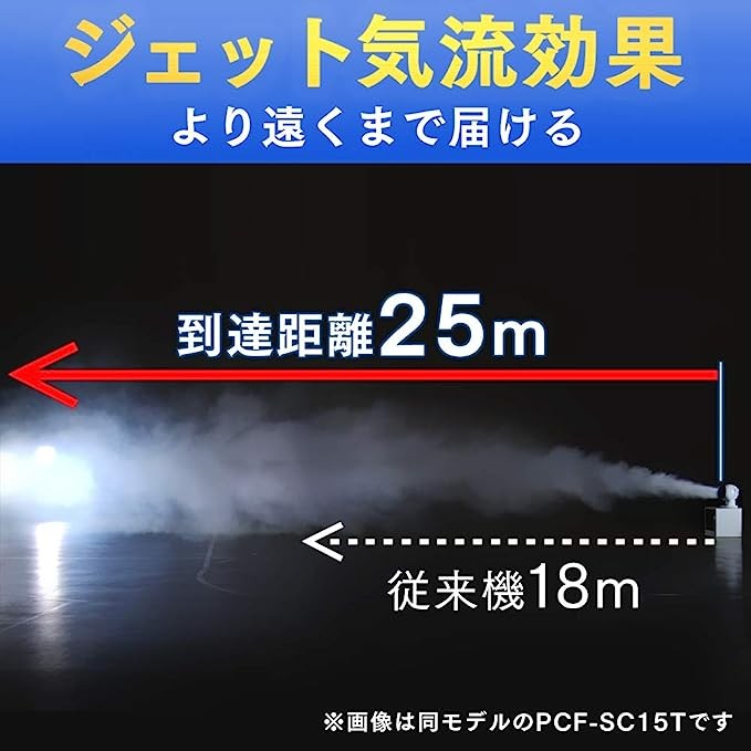 お部屋の隅々まで届くパワフル気流。上下左右に設置することでランダムな方向に風が流れます。到達距離は25mです。